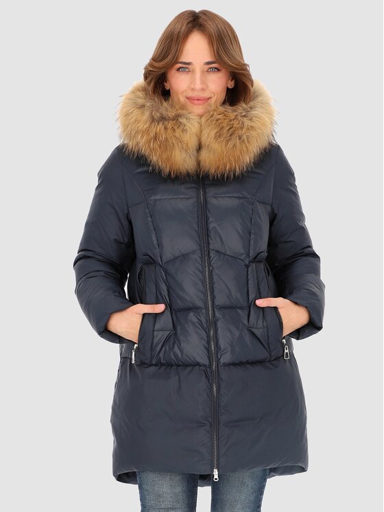 Perso Kurtka puchowa z naturalnym futrem Granatowy Slim Fit |